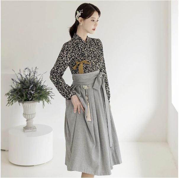 商品名 ダオル リボン配色 小花 チョリックワンピース Vネック 長袖 ひざ下丈 ハイウエスト リボン 花柄 シンプル 大人の女性 着こなし クラシック 秋 冬 ブラック S M L XL 2XL