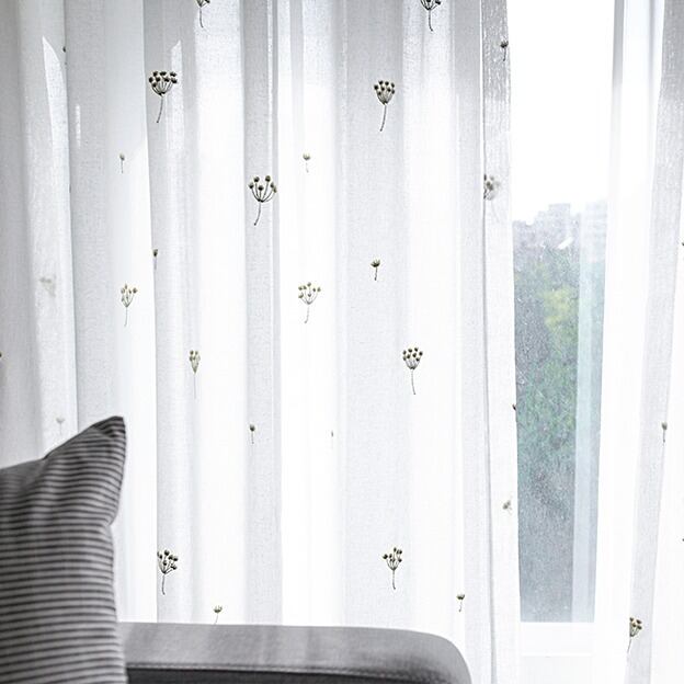 なびいているようなカスミソウの刺繍が施された内カーテンとの