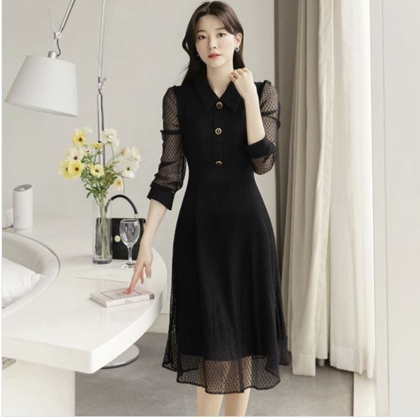 【韓服スタイル】グリアドットレースワンピース ブラック パーティードレス お呼ばれ 結婚式 ひざ丈 シースルー 長袖 シフォン ドット柄 きれいめ 上品 エレガント フェミニン S M L XL XXL
